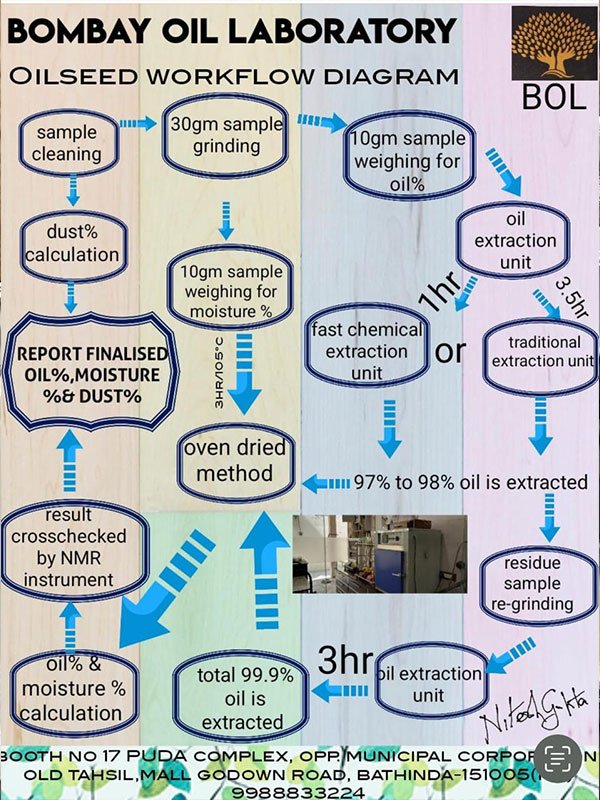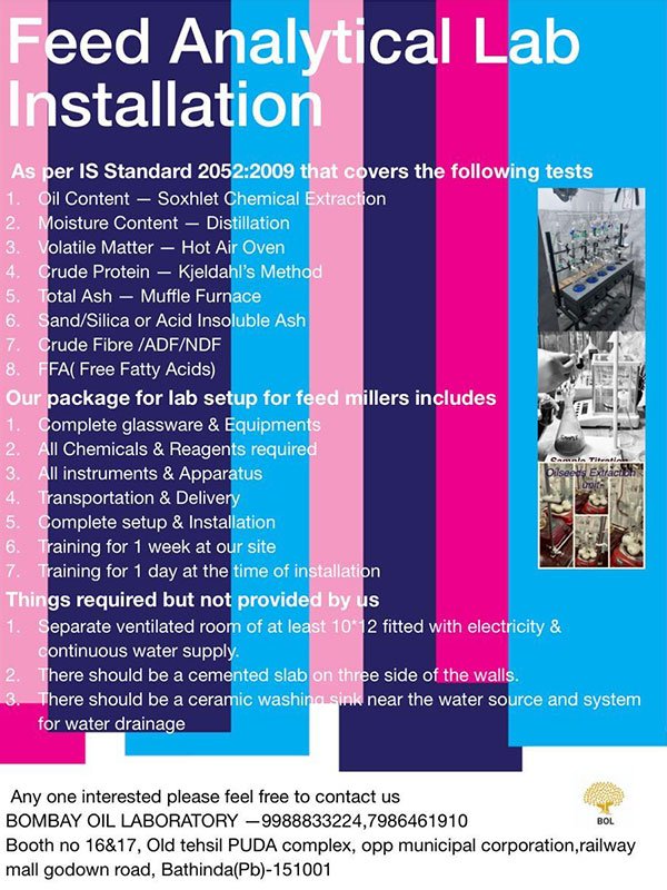 Testing parameters — Oil content, Moisture content, Crude Protein, Crude Fibre, NDF, ADF, Total Ash, Sand Silica/Acid Insoluble Ash, Aflatoxins, Insoluble Impurities, Refractive Index, Specific Gravity, Iodine Value, Saponification value, USM, Pungency, Brix, Starch, Sugar content, Colour, Peroxide Value, Fatty Acid Composition, Free Fatty Acid, etc.